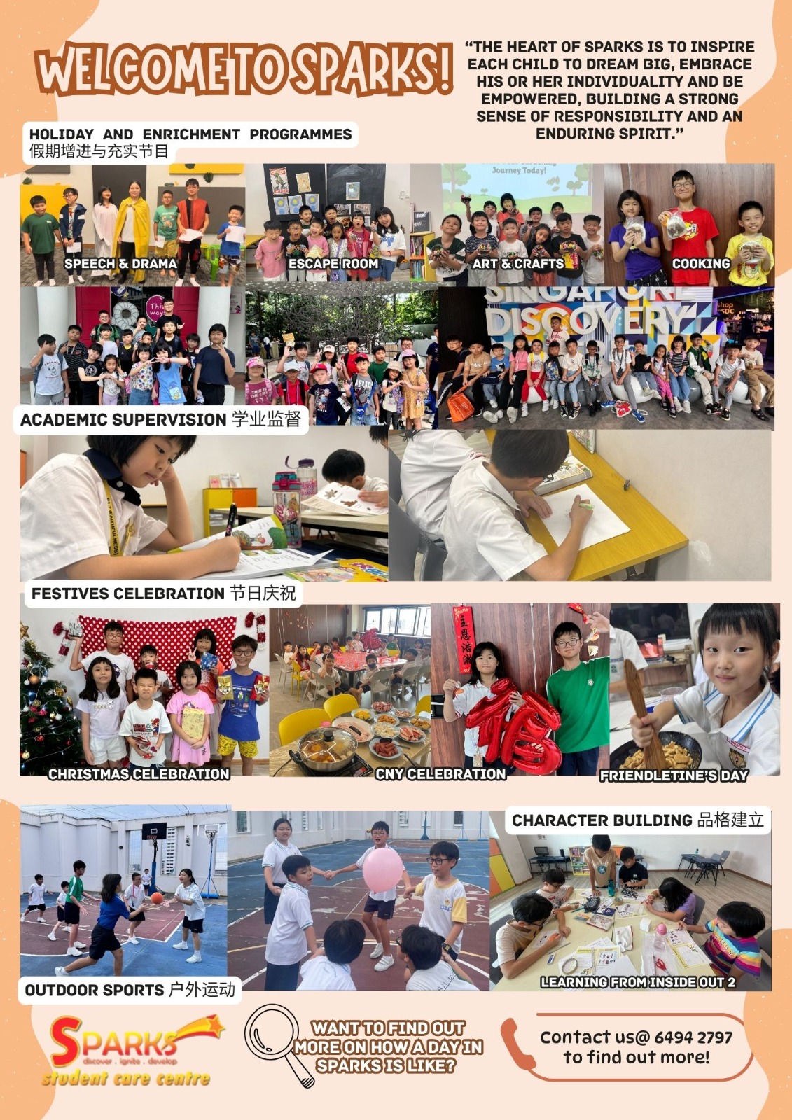SPARKS Student Care holds the mission to nurture and develop the children of our nation to possess a positive and confident self-image through our holistic mentoring programmes. We provide structured programmes to help children, age 7 to 14 years old, in their physical, intellectual, emotional, and social development.